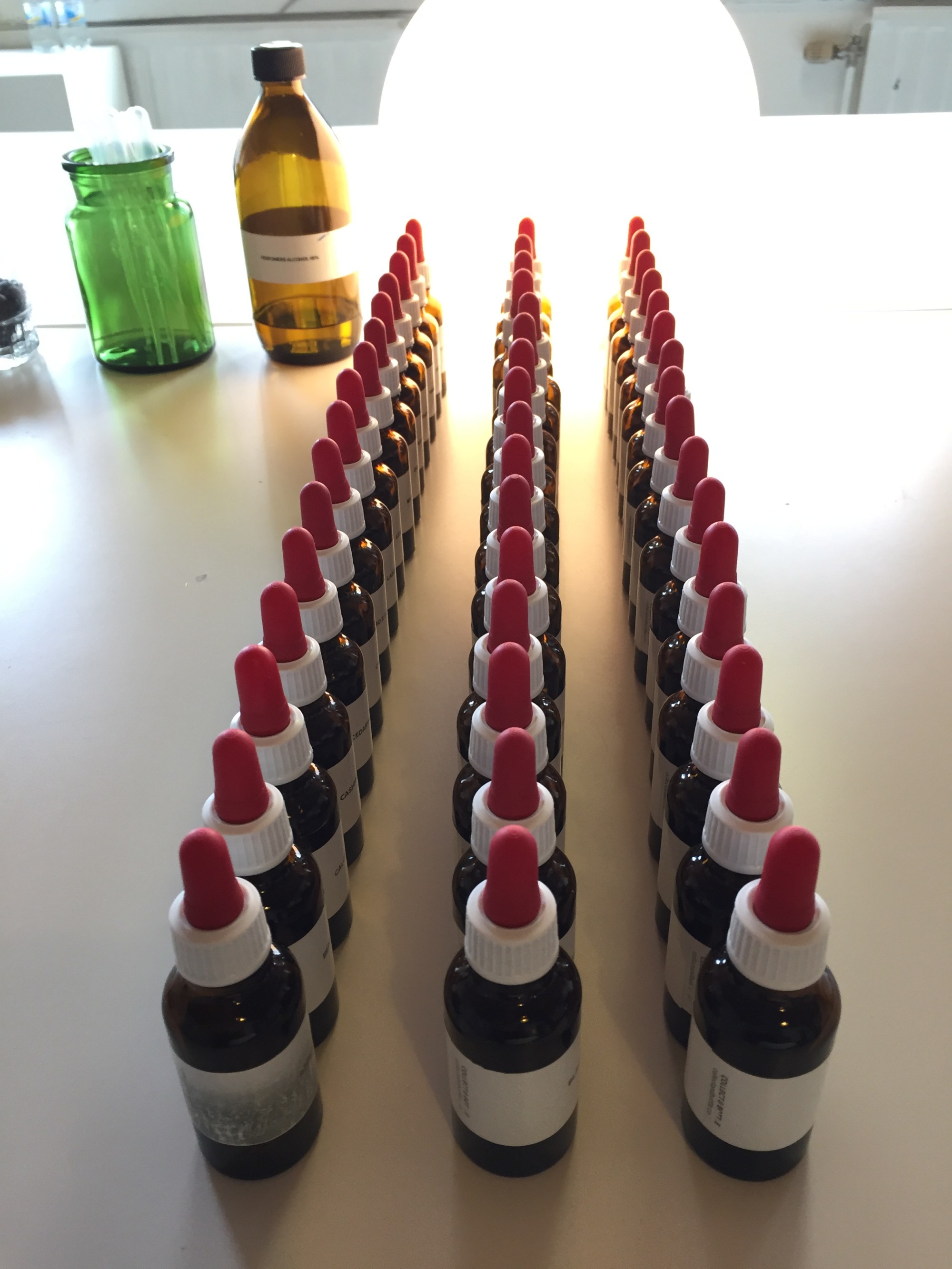 När AM var nöjd fick Andrea sätta igång och blanda de 18 doftämnena i lagoma proportioner. Totalt tog besöket drygt en och en halv timme.