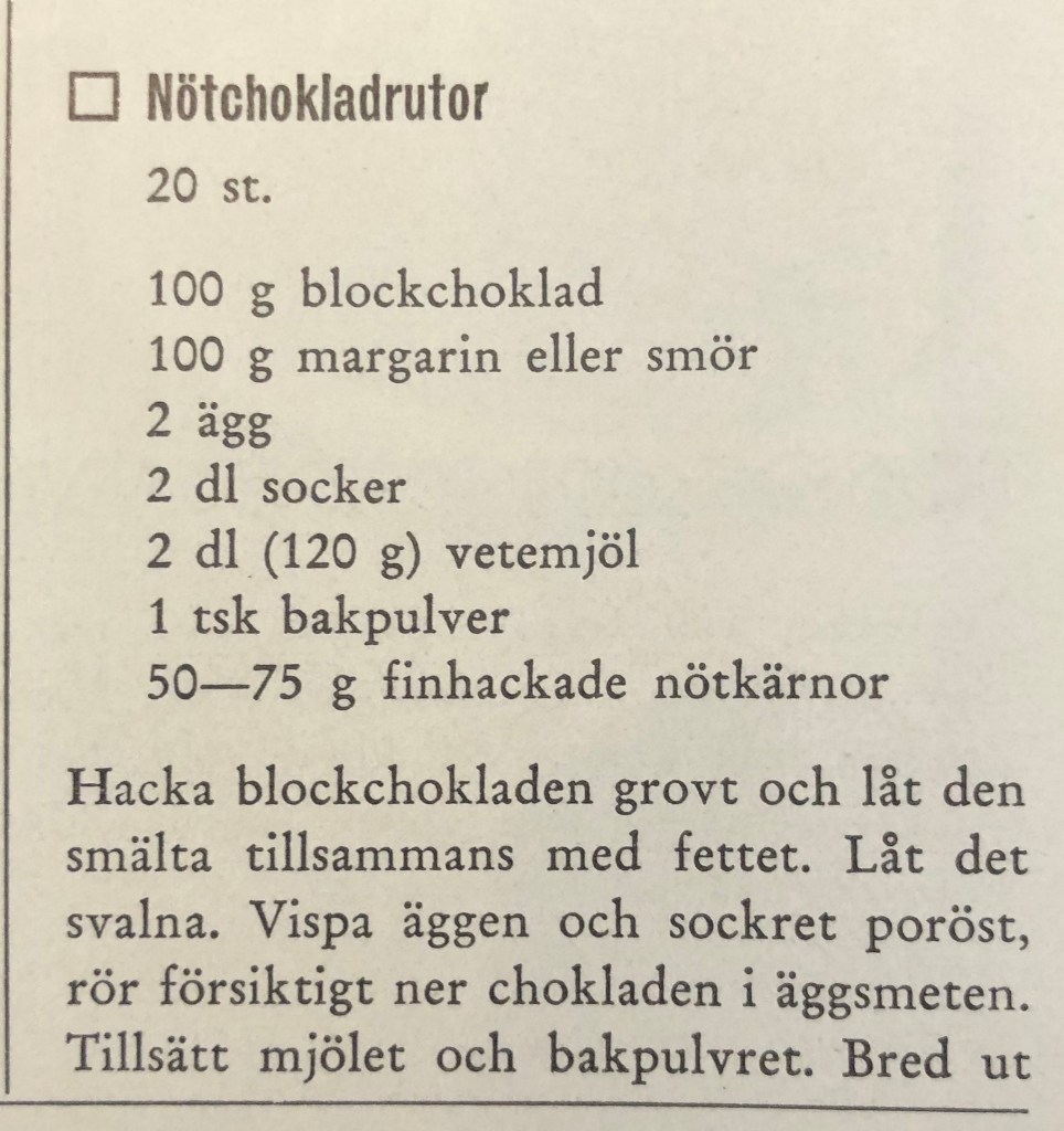 Receptet på Nötchokladrutor i den är identiskt med receptet i Ekströms receptbok, som ”det.var.godare.förr” använt. Ekströms har uppenbarligen sponsrat båda skrifterna. Hur ser då ett modernt recept ut? I senaste omarbetade versionen av Sju sorters kakor, den från 2017, konstaterar jag häpet att receptet är identiskt med det från 1931 och 1934, med enda skillnaden att 1931 kallades bakpulver för jästmjöl.