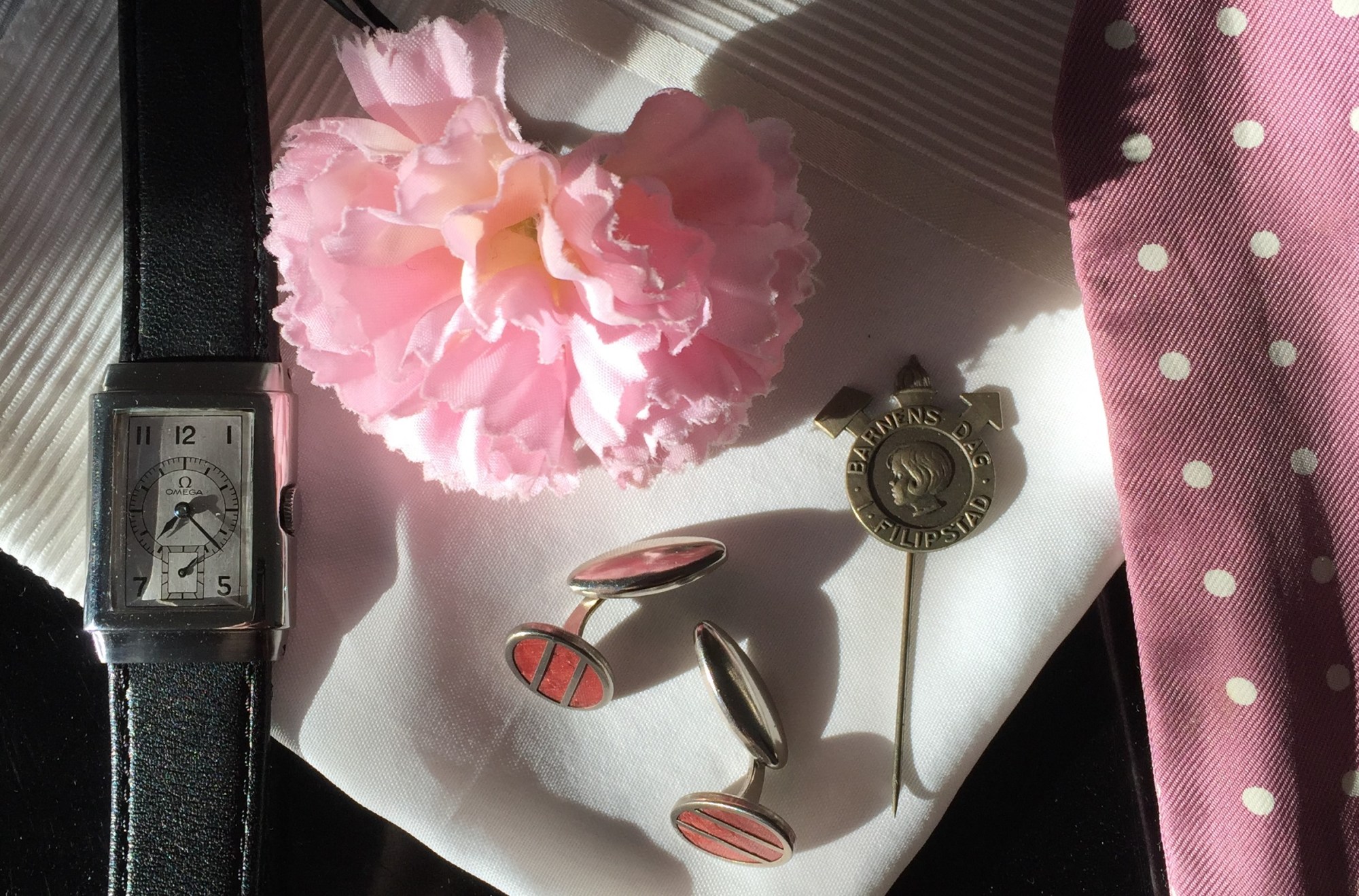 Ett nästan lika billigt nöje är blomman i knapphålet, en boutonniere som det heter på engelska. Det finns flera företag som tillverkar sådana idag, riktigt fina. I Sverige har du John-Henric och J Harvest & Frost. Edward Armah eller Gentlemans Gazette är andra. Googla runt och kolla. Vill du komma billigt undan köper du en vanlig konstgjord blomma i silke och klipper av stjälken. Eller köp en hel bukett eller en näve gamla ljusmanschetter och klipp bort de finaste blommorna. Den rosa nejlikan på vinjettbilden har jag hittat gratis på golvet på ett äldreboende. Sen gäller det bara att hitta på nåt fiffigt sätt att fästa den med en ståltråd och en knappnål på baksidan av kavajslaget.