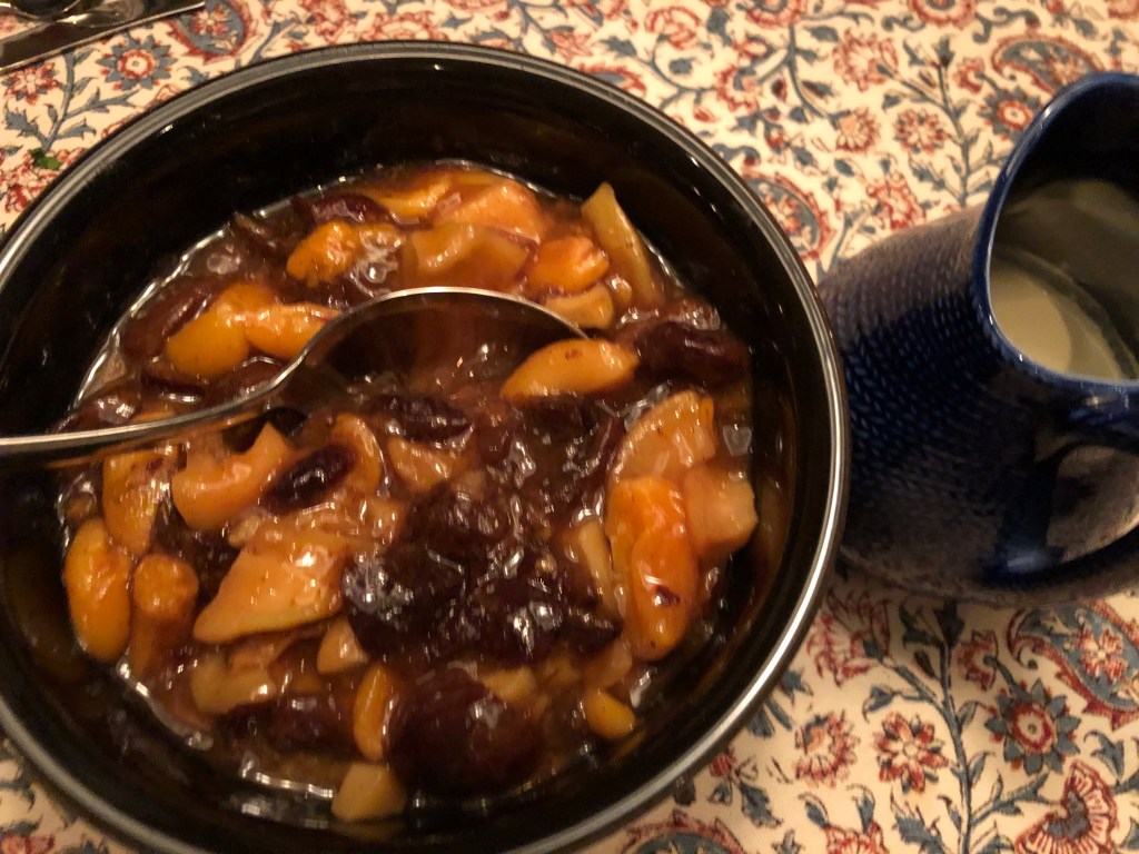 Vi fick fruktkompott med gräddmjölk när vi ätit upp våra fiskkotletter 2020.
