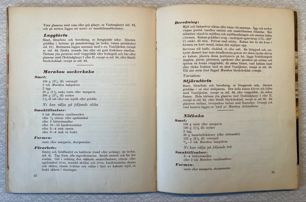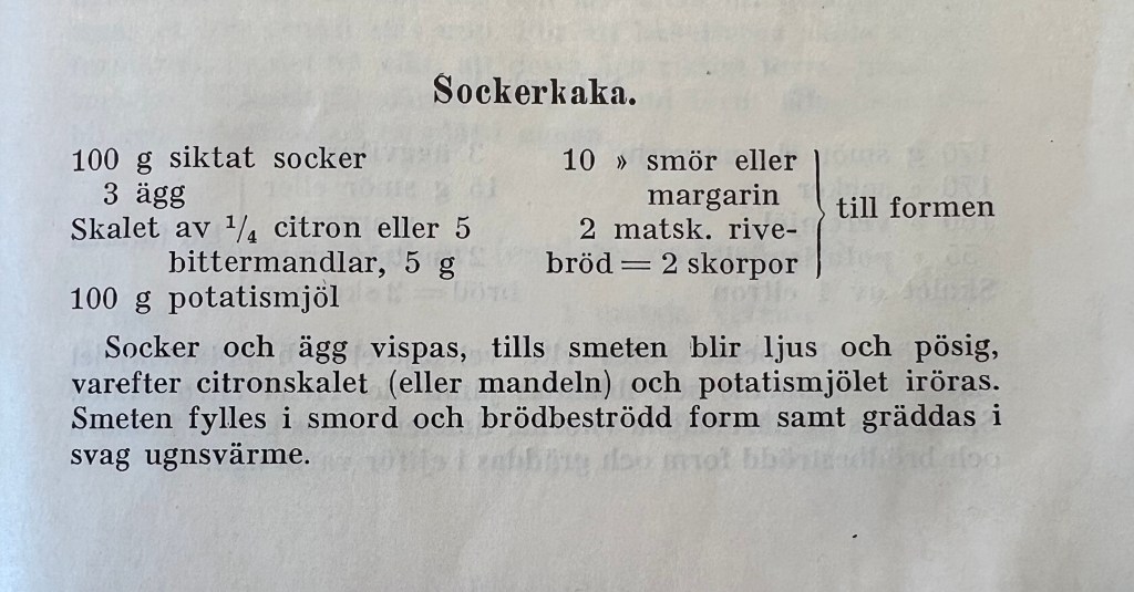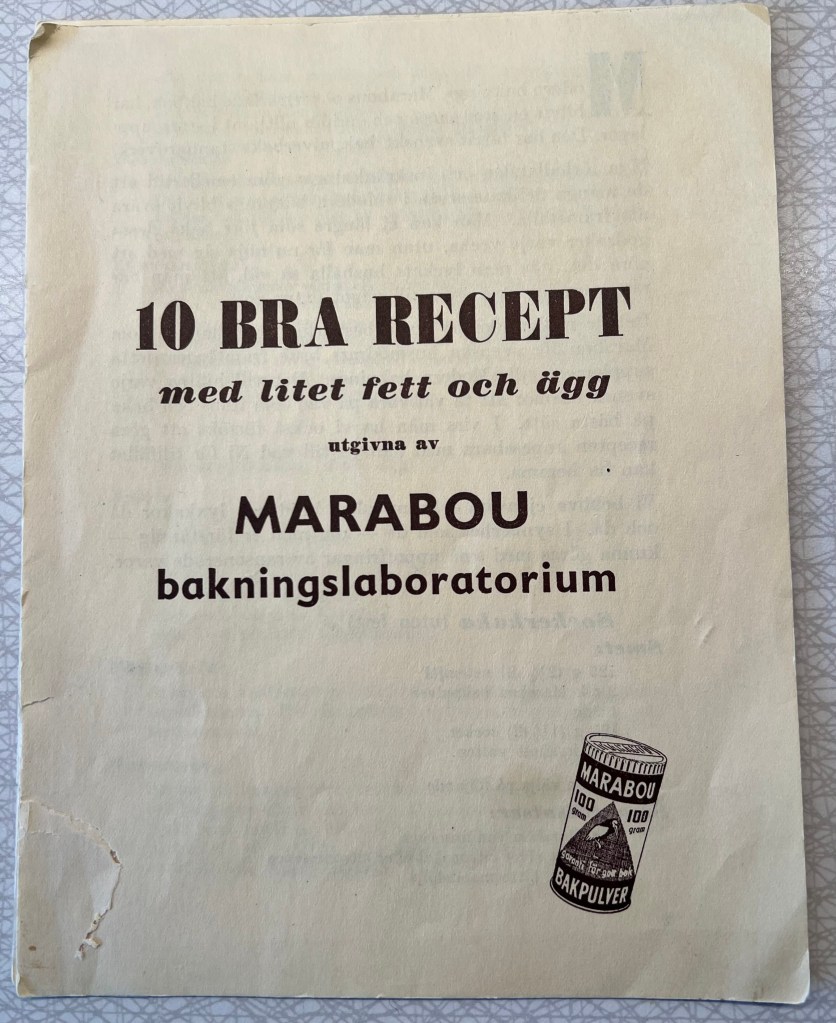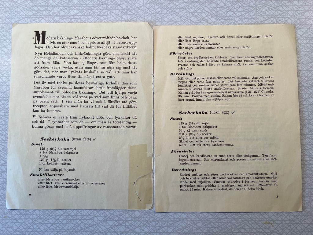 För 14 dagar sedan hade vi goda vänner över på eftermiddagsfika. Till det fikat bakade Vintagemannensberedskapsmat 3 olika sockerkakor, en med recept från ”Modern Bakning” utgiven av Marabou bakpulver 1941 och två från broschyren ”10 bra recept med lite fett och ägg” från 1942, också den utgiven av Marabou.
