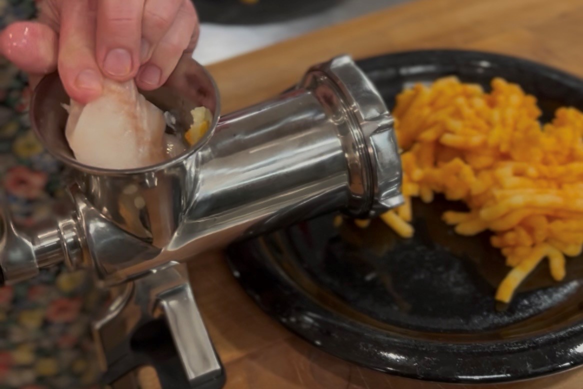 Kokt potatis, kokta morötter och fisk maldes först i en köttkvarn. Har du inte en sådan är en stavmixer det enklaste alternativet. Men om elen har gått och du inte har en köttkvarn så får du finfördela ingredienserna med rivjärn och kniv.
